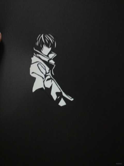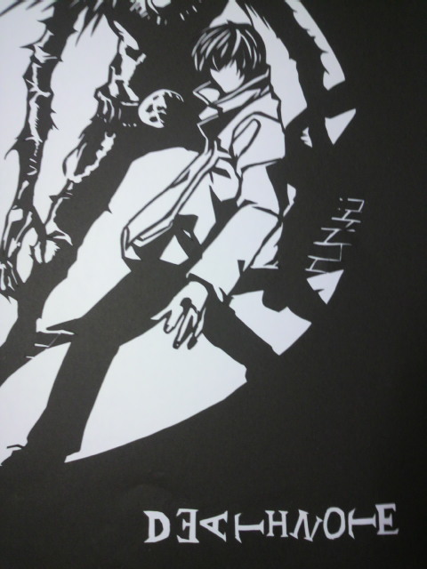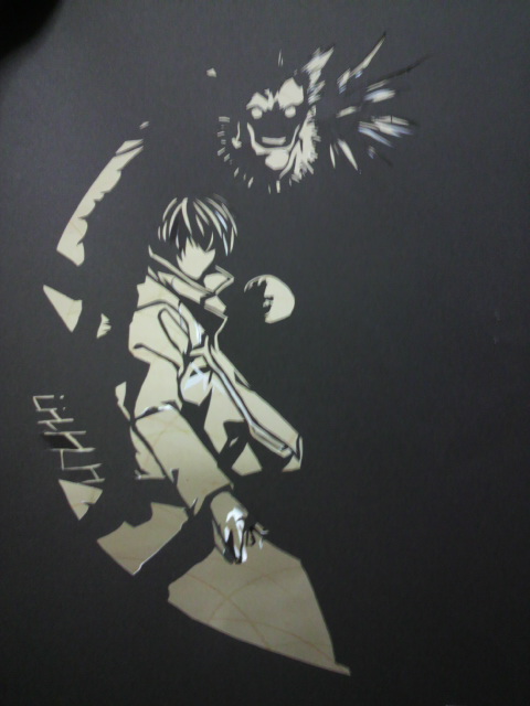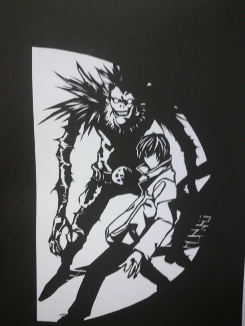 今日は仕事の合間に店に置いてあるデスノートを久しぶりに見た(;゚ー゚) やっぱこのマンガって文字多いよなぁ(((ノ∀`*) でも夢中になってしまって読み続けてしまいました(´・ω・`) んで何巻か忘れたけど切り絵に良さそうな絵があって すかさずそのページを破ってコピーしてきましたヽ(*´¬`)ノ 前回のカイジに比べて細かいけど遣り甲斐がありそうですw ではではさっそくヽ(゚д゚)ノれっつとらい! ライト君'`ァ(*´Д`*)'`ァ通称キラです コートを着てるっぽいのですが何かよくわからなくなってますw リュークの顔の辺りが一番時間かかりました。(゚うェ´。)゚。 あとはザクザクっと周りを切って一応これで完成ヽ(゚д゚)ノ ライトの顔がうまく出来なくてあとから付け足す感じにしました ほんとは目や鼻もどこからか影を引っ張ってきて繋げないと いけないんだろうなぁ(_д_)。o0○むずかしい・・・ 必ずどこかに文字を入れたくてw 今回はタイトルのDEATHNOTEの文字を入れてみました(;゚ー゚)b これもトータルで6時間くらいかかりましたw では今日はこのへんでヽ(゚д゚)ノしーゆー